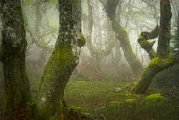 Sprookjesbos in de mist met een bemost drakenboompje. Toen ik langs dit tafereel liep zag ik meteen een draakje in de boom rechts. Ik werd helemaal enthousiast en was klaar om een foto te maken toen de mist verdween voordat ik kon beginnen. Ik wachtte heel lang, geduldig, terwijl mijn man het bos had verlaten om een goed zicht te hebben op de naderende wolken en hij zou me laten weten als er een wolk op komst was die voor mist zou kunnen zorgen. Eindelijk dreef er weer een wolk binnen en het licht doofde. Het tafereel werd donker en mysterieus, en dat is, denk ik, wat draken het liefste zien. Als je verder kijkt dan het magische, en misschien moet je dat niet doen, kun je zien dat de draak is ontstaan door een afgebroken tak. Nu zijn de bomen vooraan en de draak er niet meer, nadat een enorme storm dit gebied heeft geteisterd en verschillende bosgebieden heeft schoongeveegd, wat hartverscheurend was om mee te maken. Magie was er echter wel en ik ben blij dat ik het kan delen