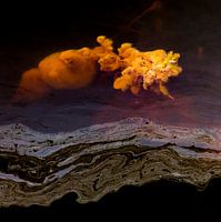 Wonderen in de sloot, Eruptie van een vulkaan van algen. Terheijden, Terheijdense Binnenpolder, Noord-Brabant, Holland, Nederlands Landschap. Spiegeling op het water van een sloot in de binnenpolder van Terheijden met een soort gele algen onder het water. De spiegeling in het blauw wordt gevormd door een oxidatieproces van algen, dat alleen in zuiver water voorkomt. Het is dus geen olie. Er is gekozen om het kleurenspel in en onder het water zo veel mogelijk tot zijn recht te laten komen. Er is verder onder water nog een kleurenspeling waarneembaar die niet weg geretoucheerd is. Er is gekozen om de natuur zo veel mogelijk tot zijn recht te laten komen. Door gebruik te maken van een polariseringsfilter is er een juiste balans ontwikkeld om de partijen onder en op het water zo veel mogelijk gelijkwaardig tot zijn recht te laten komen. Hoewel de kleuren versterkt zijn is er de voorkeur om eerst een maximale kwaliteit foto te maken, zodat er minimale correcties nodig zijn in de nabewerking van de foto. afbeelding vulkaan afbeelding algen afbeelding water afbeelding olie