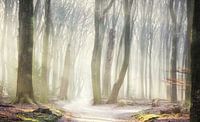 Fantastische lichtstralen tijdens een winterse mistige en koude ochtend. Een wandelpad door het bos verlicht door de zon stralen geven een speciale sfeer aan dit beeld.
