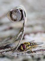 Een zweefvlieg die zich verstopt achter de krul van een berkenbast. Wat een prachtige ogen! Wie goed kijkt in de krul van de bast ziet een pakket spinneneitjes zitten. de natuur zit vol met de meeste wonderlijke dingen, hoe klein ook.