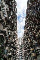 Drukke en claustrofobische woonblokken in het centrum van Hong Kong. Uitstekende balkons met in de achtergrond wolken en lucht.