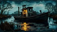 een oude woonboot in de Mississippi Delta, avondsfeer