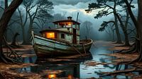 Woonboot in een vertakt deltalandschap, stilstaand water, ongerepte bomen