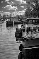 Woonboten, afgemeerd bij de Magere brug over de Amstel. De typische en prachtige wolkenlucht maakt dit werk tot een onvervalst beeld van Amsterdam.