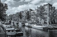 Zwart-wit foto van woonboten en typische grachtenpanden in de Brouwersgracht in de grachtengordel in het historische centrum van Amsterdam, Nederland