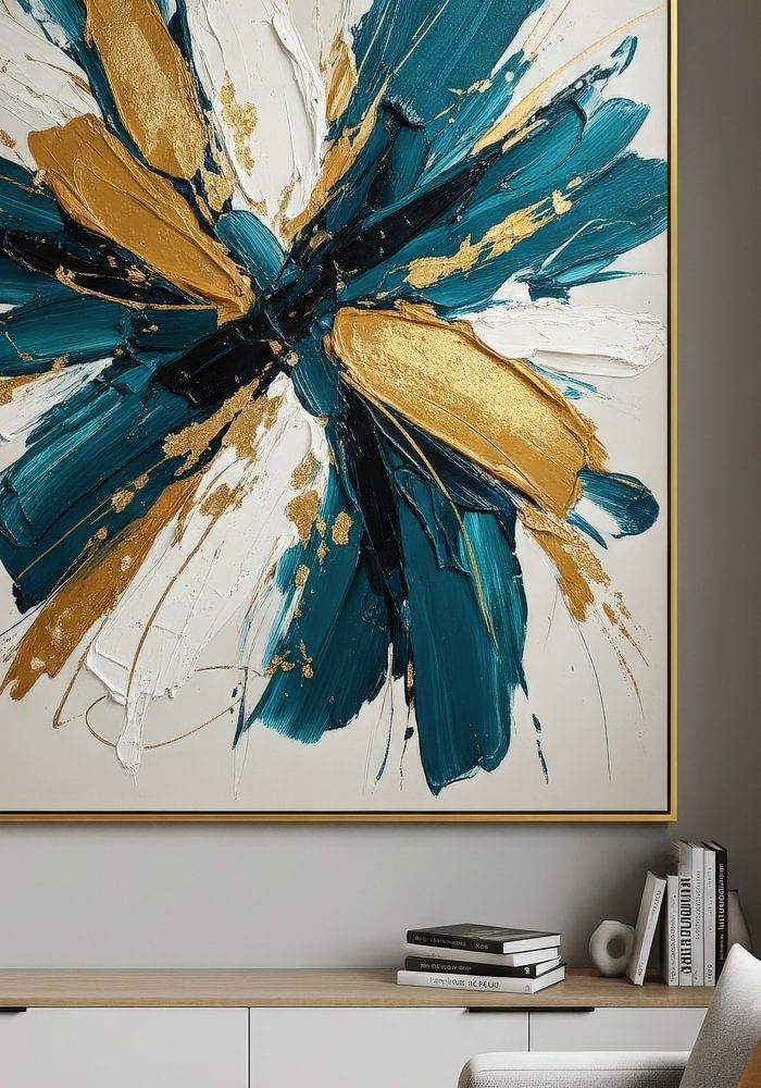 Woonkamer met abstract schilderij met groenblauwe, gouden en witte penseelstreken boven een wit dressoir, met een grijze sofa ernaast.
