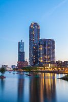 Avondopname van woontorens op de Wilhelminakade te Rotterdam, met drijvende bomen in de Rijnhaven.