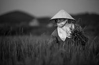 A Vietnamese woman is working a rice field at the end of a steaming hot day. Despite the temperature and high humidity, people in Vietnam like to protect themselves at all times from the sun which they consider a health hazard.