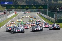 World Endurance Championship race start op het circuit van Spa Francorchamps tijdens de 2016 editie van de Zes uur van Spa Franocorchamps. De Porsche 919 Hybrids leiden het veld met daarin de Audi R18, Toyota TS050 en verschillende GT auto's zoals de Ferrari 488 GTE, Aston Martin Vantage, Ford GT en Porsche 911.