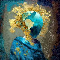 Schilderij in Gustav Klimt schilderstijl met voornamelijk blauw,turquoise en petrol tinten met goud accenten.