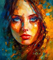 Een wereldse vrouw genaamd Jade op de wijze van palet mes portret is een digitale weergave van Jade, waarbij gebruik is gemaakt van palet mes technieken. Het portret is digitaal bewerkt met veel kleuren tinten, wat zorgt voor een levendige en krachtige uitstraling. Het geheel creëert een uniek en eigentijds beeld van Jade, die zelfverzekerd en zelfbewust overkomt.