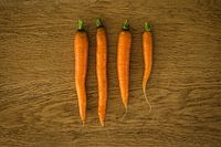 Vier gewassen wortels op een houten keukenblad.