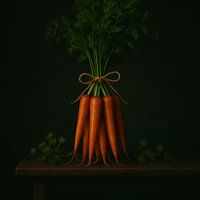 Een verrassend elegant boeket van wortels, artistiek samengebonden en gestileerd tegen een donkere achtergrond. Minimalistisch, met een vleugje humor voor de culinaire kunstliefhebber.