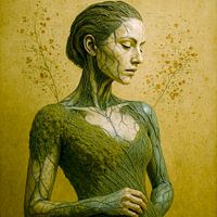 In het midden van een stille, tijdloze ruimte rijst een figuur op, half vrouw, half natuurlijk wezen, in perfecte symbiose met de organische wereld. Haar huid ziet eruit als een fijn weefsel van doorschijnend gebladerte, doorkruist door delicate lijnen die doen denken aan aderen of wortels - een netwerk van levende energie. Waar ooit stof had gezeten, groeit nu mos, zacht en glinsterend groen, alsof de aarde zelf haar bekleedt.