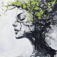 combinatie van natuur en menselijke vorm, waarin het profiel van een vrouw overgaat in een surrealistisch landschap van takken en bladeren. Het monochrome palet van zwart, wit en grijstinten benadrukt de dramatiek en maakt de felgroene bladeren extra levendig en symbolisch. Deze bladeren, die lijken te ontspruiten uit haar haar of hoofd, symboliseren mogelijk groei, verbinding of wedergeboorte.