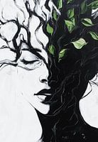 krachtig en symbolisch portret dat de verbinding tussen mens en natuur benadrukt. Het gezicht van de vrouw, met gesloten ogen, straalt een serene rust uit, terwijl haar haar transformeert in abstracte, boomachtige takken. De rechterzijde van het gezicht en haar silhouet zijn gehuld in een diepe zwarte schaduw, wat een dramatisch contrast creëert met de lichte en vloeiende lijnen aan de linkerzijde. Groen bladeren die uit de takken groeien, voegen een levendig en organisch element toe, waardoor het werk een balans krijgt tussen mysterie en vitaliteit.