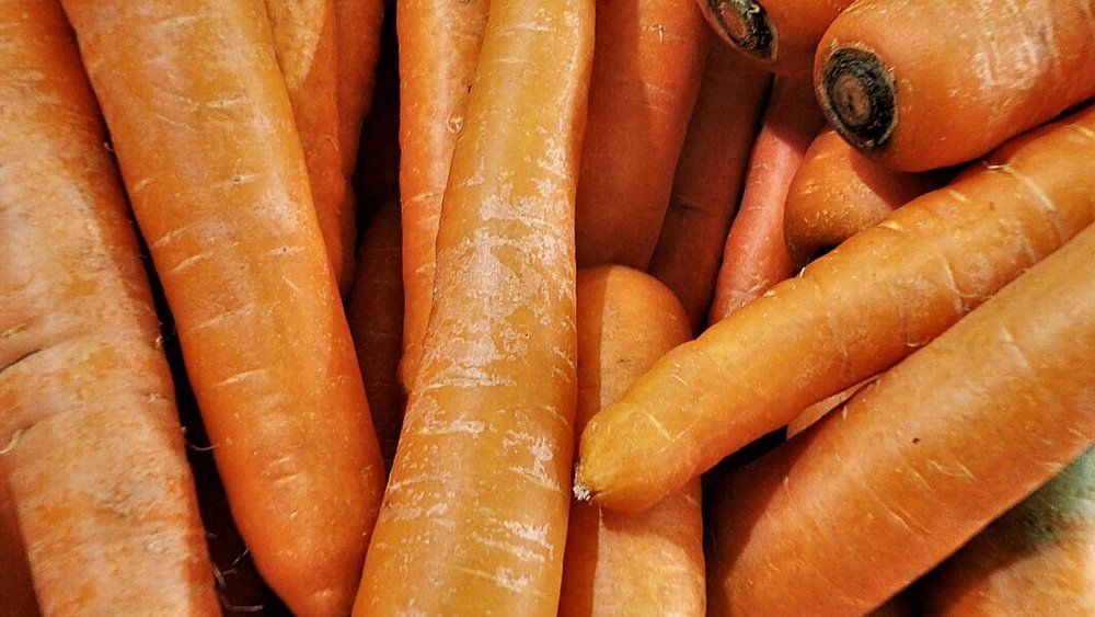 Een heldere en energieke afdruk van groentefotografie gericht op een dichte tros verse, levendig oranje wortelen. De foto benadrukt de opvallende verticale lijnen van de wortels, die het hele frame vullen en een sterk gevoel van textuur en patroon creëren. De levendige oranje kleur is zeer verzadigd en springt meteen in het oog, en viert de eenvoudige, krachtige kleuren van de overvloed van de aarde's. De lichte variaties in kleur en de ruwe textuur van de wortelschillen voegen diepte en authenticiteit toe. Dit vrolijke stuk is ideaal voor het opfleuren van een keuken, een gezonde eetgelegenheid of elke andere ruimte die baat heeft bij krachtige, natuurlijke kleuren. Het is een uitstekend voorbeeld van hoe alledaagse voorwerpen kunnen worden getransformeerd in dwingende, repetitieve moderne abstracte kunst of een levendige natuurfotografiemuurkunst.