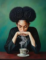 Het portret van een jonge vrouw, geduldig wachtend tot haar kop thee voldoende is afgekoeld om het te kunnen drinken.