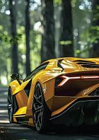 Een verbluffend digitaal schilderij dat de rauwe kracht van een Lamborghini vastlegt terwijl deze door een kronkelige bosweg navigeert. De levendige kleuren en dynamische compositie creëren een gevoel van snelheid en opwinding.