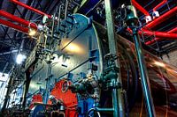 Stoomketel, afsluiters en pijpen van een waterpomp station.