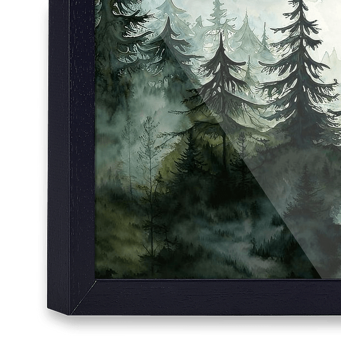 Dit serene, krachtige kunstwerk is een sublieme aquarelvoorstelling van een dichtbebost berglandschap, gehuld in de zachte sluier van ochtendmist.