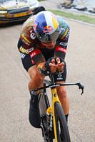 Wout Van Aert aan het werk op zijn Cervelo tijdritfiets in de ronde van Frankrijk. Herkenbaar aan zijn unieke helm rijdt hij zo je kamer binnen in zijn gekende stijl.