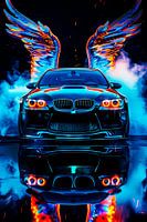 Een woeste BMW M3 met vurige neonvleugels en gloeiende rode ogen. De perfecte symmetrie in de waterreflectie voegt een bovennatuurlijke, high-octane energie toe.