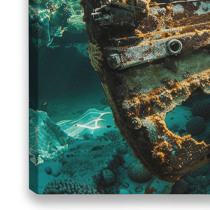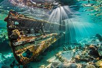 "Secrets of the Deep" onthult een fascinerend onderwaterpanorama met een majestueus gezonken schip ingebed in kristalhelder, turquoise gekleurd water. De zonnestralen die door het water breken verlichten het wrak en het omringende koraallandschap, waardoor een adembenemend tafereel van leven en verval ontstaat. Dit kunstwerk is een…