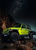 Sterrenkijker: Een levendige Jeep Wrangler staat stoer op een rotskust, verlicht tegen de adembenemende Melkweg. Avontuur opnieuw gedefinieerd onder de kosmos.