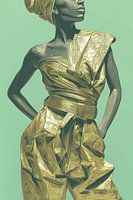 Een stijlvolle vrouw gehuld in een glanzend, geplooid gouden outfit. Sterke houding, elegante lijnen - mode wordt kunst.
