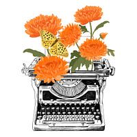 Een vintage typemachine, gevuld met bloemen en een vlinder.