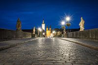 Het uitzicht over de Oude Hoofdbrug in Würzburg naar het stadhuis en de kathedraal van Würzburg in de avond