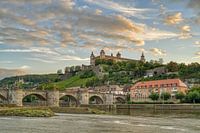 Uitzicht vanaf de oever van de Main in de richting van de Alte Mainbrücke en de vesting Marienberg op een avond in de nazomer.