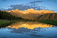 Uitzicht op het Catinaccio-massief vanaf de Wuhnleger Weiher-vijver bij zonsondergang, Dolomieten in Zuid-Tirol, Italië