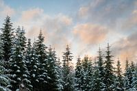 Besneeuwde boomtoppen in het Rhenense Bos. Wie niet beter zou weten zou denken dat het in de Oostenrijkse bergen zou zijn. De prachtige zonsondergang en de meesleurende wolken maken het helemaal af!