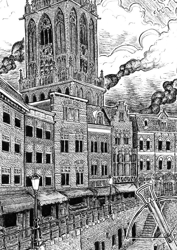Fantasie illustratie van wyverns boven de oude stad van Utrecht. Gezien vanaf het oude stadhuis richting de Domtoren langs de Oude Gracht.