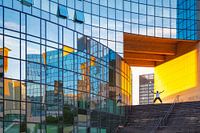 Moderne architectuur met spiegelende ruiten en fraaie lijnen. Een avond met mooi warm licht. Alleen al daarvoor was ik naar deze plek gegaan. De jongeman die zich helemaal uitleefde bovenaan de trap zette het bekende puntje op de i van deze foto.