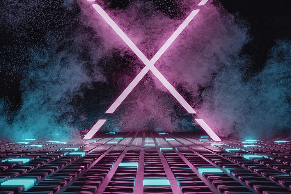 X vorm in felle neon magenta kleur staat op gekleurde knoop velden