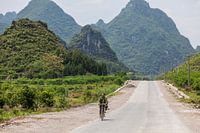 A man drives his bicycle down a road near Yangshuo, China. The region is famous for its karst peaks, rivers and caves.
