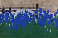 Blauwe irissen met groen blad, waterpartij in zilver mica en een zigzaggende brug.