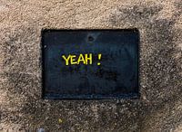 Een zwarte ijzeren muurplaat, waarschijnlijk van een brievenbus, met daarop met gele verf Yeah! geschreven. Het leverde een mooi stilleven op.