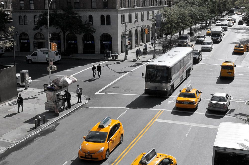 Uitzicht vanaf de High Line op een alledaags straatbeeld in Chelsea, New York City. Alleen de gele objecten zijn in full color, de rest van de kleuren in de foto op 25%.
