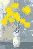 Yellow Bloom - Dit bloemen schilderij toont een kleurrijke vaas met felle gele bloemen op een subtiele grijze achtergrond, die samen een vrolijke sfeer creëren in een modern interieur.