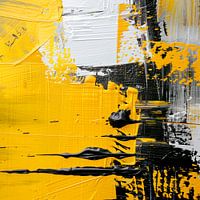 Een abstract schilderij met opvallende streken felgeel, contrasterend zwart en subtiel wit. De verf is op sommige plekken dik aangebracht, wat een dynamisch samenspel van kleuren en lagen creëert, met zichtbare penseelstreken en druppels die diepte aan de compositie toevoegen.
