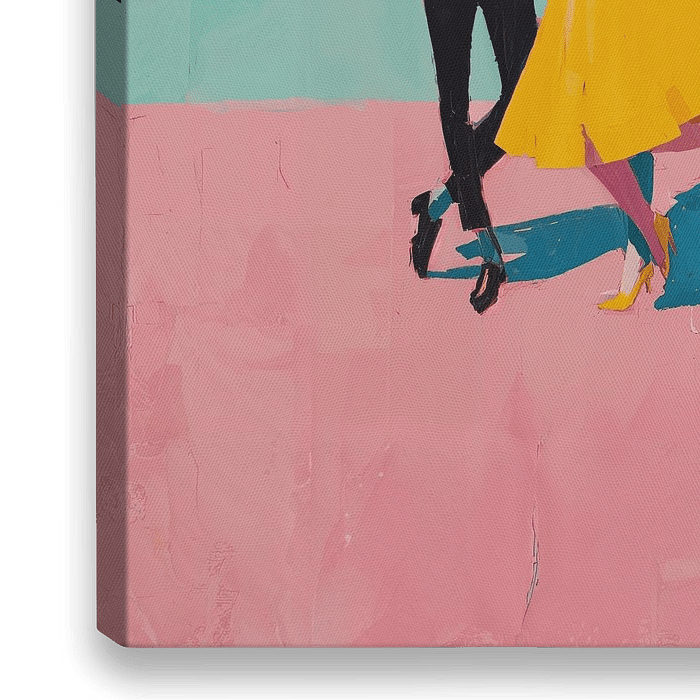 Yellow Dance - Dit schilderij toont een vrouw in een prachtige gele jurk en een man in een stijlvolle outfit, die samen op een roze ondergrond staan en een flirtende pose aannemen, onder een helderblauwe lucht, wat een energiek en vrolijk gevoel oproept.