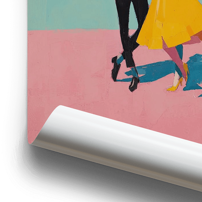 Yellow Dance - Dit schilderij toont een vrouw in een prachtige gele jurk en een man in een stijlvolle outfit, die samen op een roze ondergrond staan en een flirtende pose aannemen, onder een helderblauwe lucht, wat een energiek en vrolijk gevoel oproept.