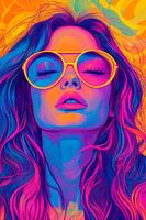 Een levendig portret van een vrouw gestyled op een artistieke manier. Ze draagt ​​een zonnebril in een felgele kleur die contrasteert met haar kleurrijke gelaatstrekken. De huidskleur van de vrouw is een mix van levendige roze en blauwe tinten, wat een opvallend visueel effect creëert. Het beeld geeft een gevoel van vrijheid, vreugde en…