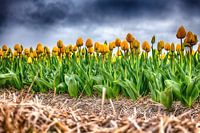 heerlijke contrastfoto van mooie tulpen met regenwolken als decor