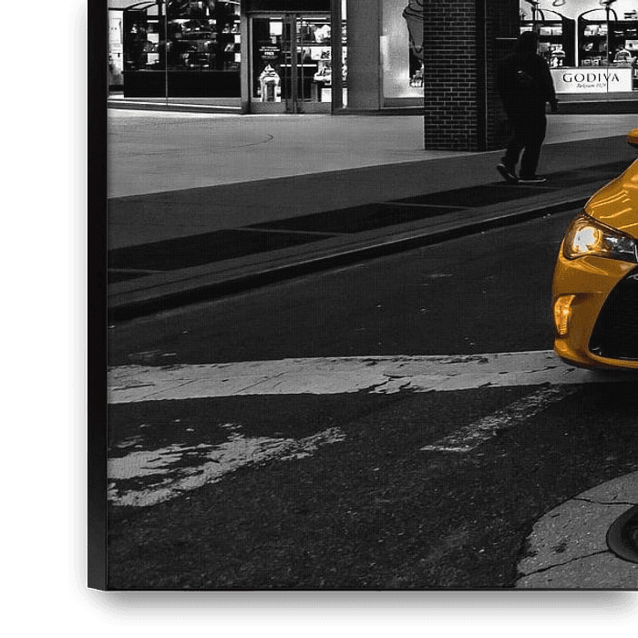 Koop de foto Yellow cab in New York van Kimberly Lans op canvas, aluminium dibond, (ingelijste) fotoprint, behang en ArtFrame, op maat geprint in Fine-Art kwaliteit.