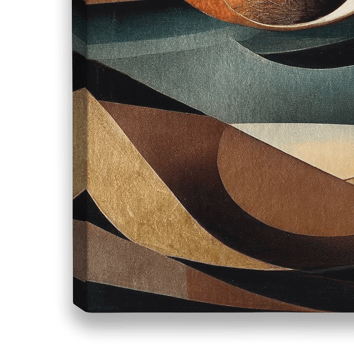 Moderne abstractie met yin yang symbool, grafische vormen en vloeiende lijnen in aardetinten op een hout structuur.